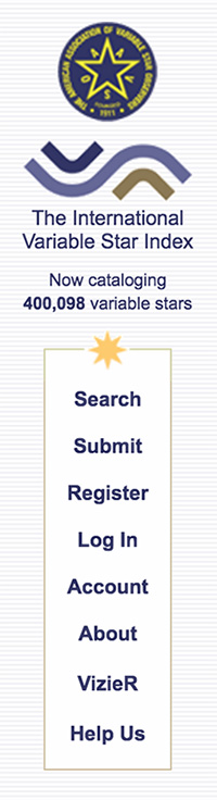 Data on variable stars are constantly changing. New and ongoing surveys are locating new variable stars every day. Corrections to errors in the data are always coming in. But all of this work to refine what we know about these stars is happening at different times and in different places. The mission of VSX is to bring all of that new information together in a single data repository, make it accessible to the public via a simple web interface, and provide the tools necessary for the controlled and secure revision of the data. Originally designed and programmed by Christopher Watson and maintained by the AAVSO, VSX is now the most accurate and complete variable star catalog on Earth, containing records for 400,098 stars.