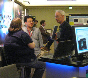 Then it was just a case of getting them into the hands of as many people as possible. Each of us had our own style. Some preferred the passive approach and others (like me!) were a bit more aggressive about it. Our volunteer, John O'Neill (ONJ), expertly distributed books to other exhibitors and to graduate students tending their posters in another room.