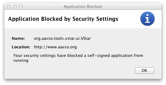 The problem is that Java just changed its definition of "high risk" applications to include those with "self-signed" security certificates such as the one the AAVSO is currently using for VStar. We are looking into our options for purchasing a certificate from an official "Certifying Authority" which will solve the problem, but in the meantime, the above mentioned work-around should get things up and running again.
