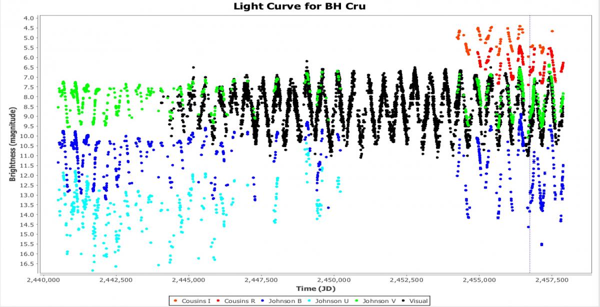 The first observation for BH Cru in the AAVSO International Database (AID) is from 1969 just after it was discovered. Currently the AID database has 9360 observations in visual and multi-bands. Many of the observations have been made by visual observers.