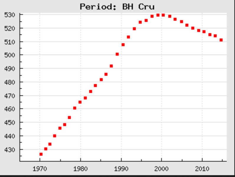 Since it was discovered in 1969 by R. G. Welsh, BH Cru's period has increased from about 421 days in 1970 to about 525 days around 2000. Since 2000 BH Cru's period has slowly but steadily decreased to about 505 days currently and may now be stable.