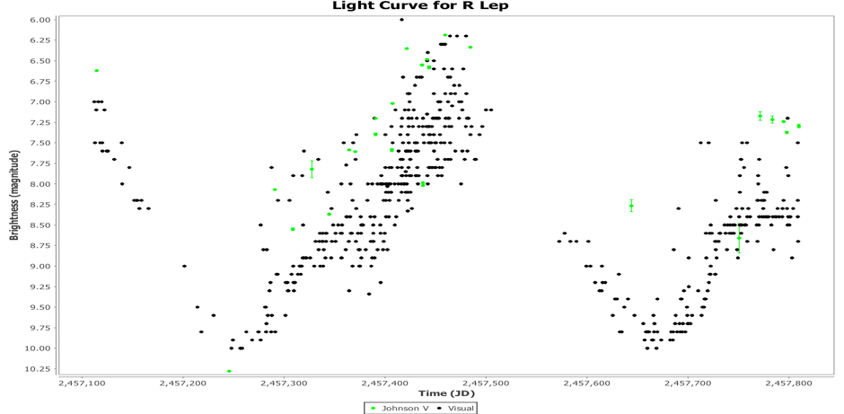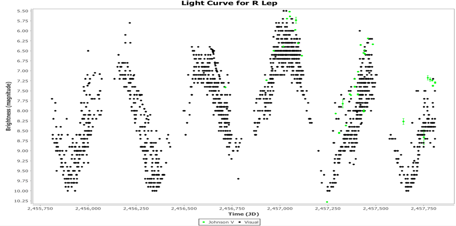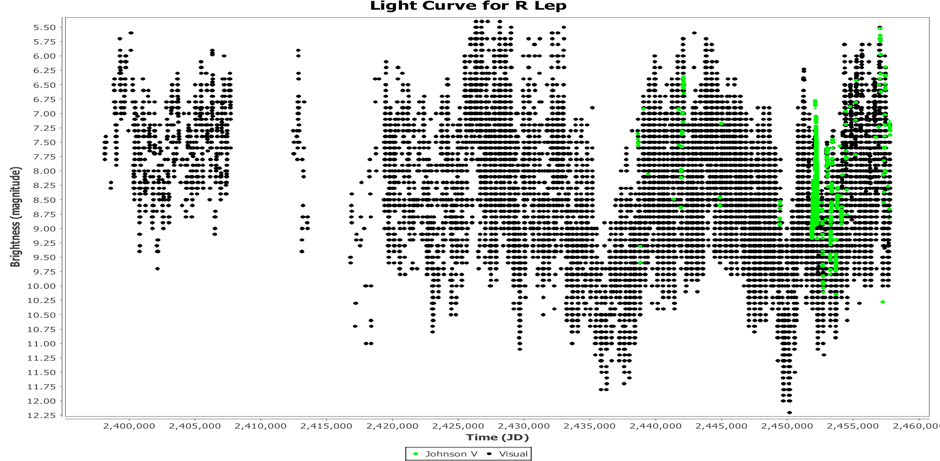 It's spectral class is C7 according to the VSX and is classified as a Mira. The GCVS lists R Lep as having a visual magnitude range of 5.5 to 11.7 with a period of 427.07 days. However the GCVS does note that there have been changes in the star’s period. Up until 1891, the GCVS states that the period was 436.44 days, between 1891 and 1921 it was shorter at 418.04 days, between 1921 and 1957, it increased to 441.38 days and since 1957 it’s period has been at the quoted duration of 427.07 days. Analysis of all AID data using VStar in the period 1853 to the present day indicates an overall mean period of 436.7 days.