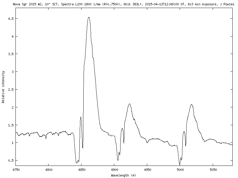 Nice work Jonathan! Here's some spectral profiles I obtained before, during and after (first?!) maximum showing the significant changes to the spectrum of this nova. Pre-maximum there were strong P Cygni profiles, around maximum the emission lines flattened and post maximum the emission lines returned but the P Cygni profiles had virtually disappeared.