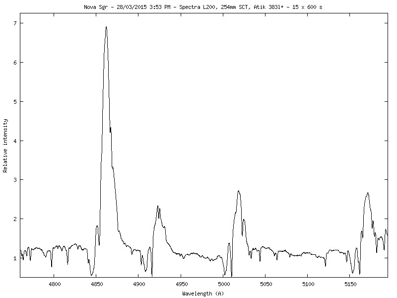 Arne, the spectral behaviour of this nova is very interesting. I'm taking regular low-resolution (R=700) spectra of the optical range 3800-8600 Ã…ngstrom, and select higher-resolution spectra of the FeII region around 5000, the Na and He I lines at 5890 and 5876, and the OIL and CI lines at 7003 and 7115.