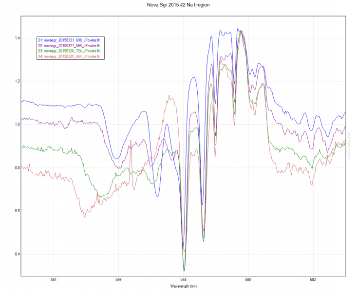 The picture is muich more complex since 2015-03-22. There are distinctly different velocities for different lines (e.g. 1800 km/s for H alpha on 2015-03-23, but 1100 km/s for the Na I 5890 line at the same time). I have yet to reduce the data, but I have spectra from the last three nights of the 5650-5950 region that show double P Cyg profiles - higher and lower velocity components for the same lines.