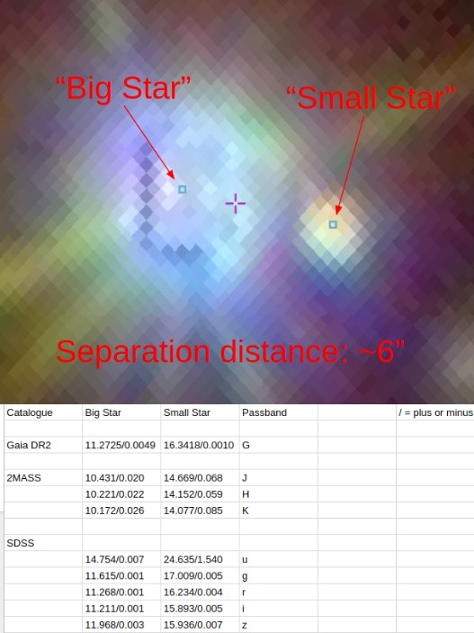 One thing to keep in mind, the potential third star shrinking the amplitude is not the 16.6 mag. companion, which is an unrelated object (Gaia DR2 parallaxes are very different) not contributing to the combined light (a mag. difference of >5 mag. means contribution will be <0.01 mag.). Just to avoid confusions in that regard. Thus there is no need to mention the companion in the remarks either.