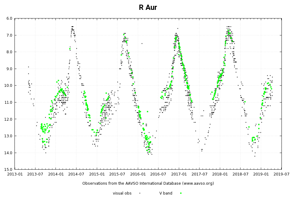 I have the impression that R Aur is very probably developing a new hump. Observations submitted in the last weeks, particularly photometry with the V filter, show an incipient but very clear "faint" maximum during the current raising phase (link). This potential new hump is a bit brighter but otherwise rather similar to one observed in 2014 (See attached plot below). We will have to wait (and observe) to see what will happen.