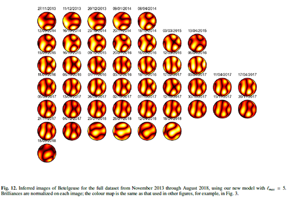 Betelgeuse has the largest angular diameter of any star (with the exception of our Sun) due to its massive radius (over 600 times our Sun’s) and relative closeness (~200 pc). This gives us a unique opportunity to study its convective cells because we can resolve it past a point source. Lopez-Artiste et. al. (2018) studied the motion of these convective cells from 2013 to 2018. The infrared images from their study are below. They also found evidence of strong, super-sonic upflows which are dominated by the convective flows.