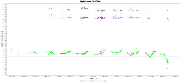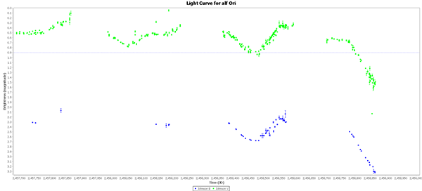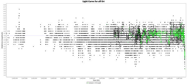 The dimming is very apparent when looking at the last 33 years of Johnson V data. The previous lows in this data were 1.03 measured by FEO on 2008 and 1.03 measured by WJM in 1988. Current V magnitudes are in the 1.5s.