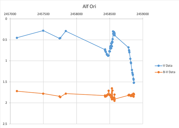 If you look at recent V and B data, you will see they’re tracking each other. This is typical for pulsating stars as they go through their normal cycle and an indication that the effective temperature of the star is not changing. However, this standard color index may not be totally appropriate since a star like Betelgeuse emits most of its energy in the IR (Percy 2007).