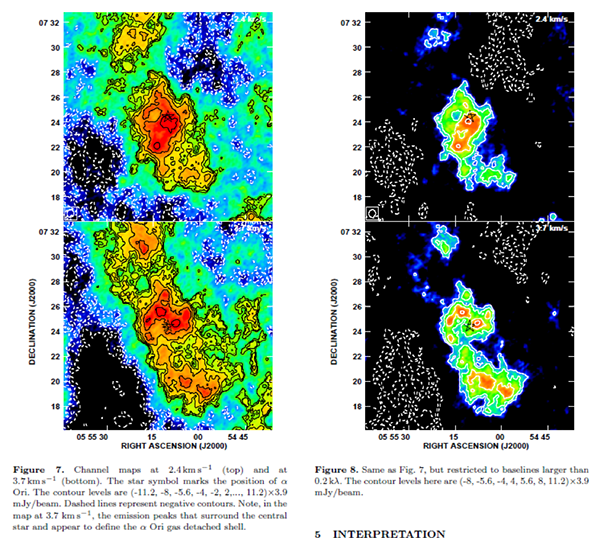 Speaking of expelling gas and dust, Betelgeuse has a large, detached circumstellar envelope. Betelguese is losing about 3x10^-6 solar masses per year, which is equivalent to the mass of the Earth. This mass loss has been occurring for about 1000 years, although a second outflow has been discovered which is probably 380 years old (Gorman et al, 2002). Haubois et. al. (2019) studied the winds of these two outflows and found an inner dust shell about 0.5 Betelgeuse radii above the star’s photosphere and an outer shell between 2 and 2.5 Betelgeuse radii out. The outer shell was found to be elliptical in shape and much brighter in the Mid-IR than the Near-IR, possibly due to light scattering from SiO and Al2O3 molecules found in the dust shell. LeBerte (2012) mapped the H1 regions of the shell with the VLA and found the shell to extend out to 0.24 pc. The shell is elongated along the proper motion of the star, as shown below.