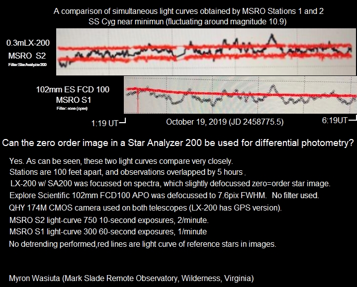 I am very new to spectroscopy, but thanks to Robin's informative posts have been learning alot. I am particulary interested in using the zero order star image of the Star Analyzer for differential photometry of spectroscopy targets. This allows an efficient use of time and equipment (both of which are always limited!). With SS Cyg well placed for observation, I have been observing it with a 12-inch LX-200 nightly since September 24, 2019 using a SA200 for spectroscopy and creating light curves using the zero order image. I have over 5000 spectra so far! Its fascinating seeing the changes in the spectrum and being able to correlate them with exact places on the light curve! One concern I had though was how precise was the curve obtained using the SA200. So on the night of October 18- 19, 2019 I observed SS Cyg with two telescopes 100 feet apart, using the same type of CMOS camera (QHY 174) for 5 hours.One telescope was the 12-inch LX-200 using a SA200. The other was an Explore Scientific 102mm FCD100 APO refractor. I focussed on the spectra in the 12-inch, and used the defocus method (7.6pix FWHM) with the 102mm APO. SS Cyg was near minimum and flickering like crazy. I am happy to report both light curves are nearly identical. Attached to this message is an image of the results and a sample of the spectra resolution I am getting.